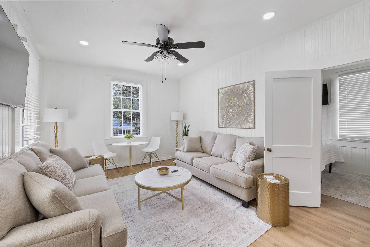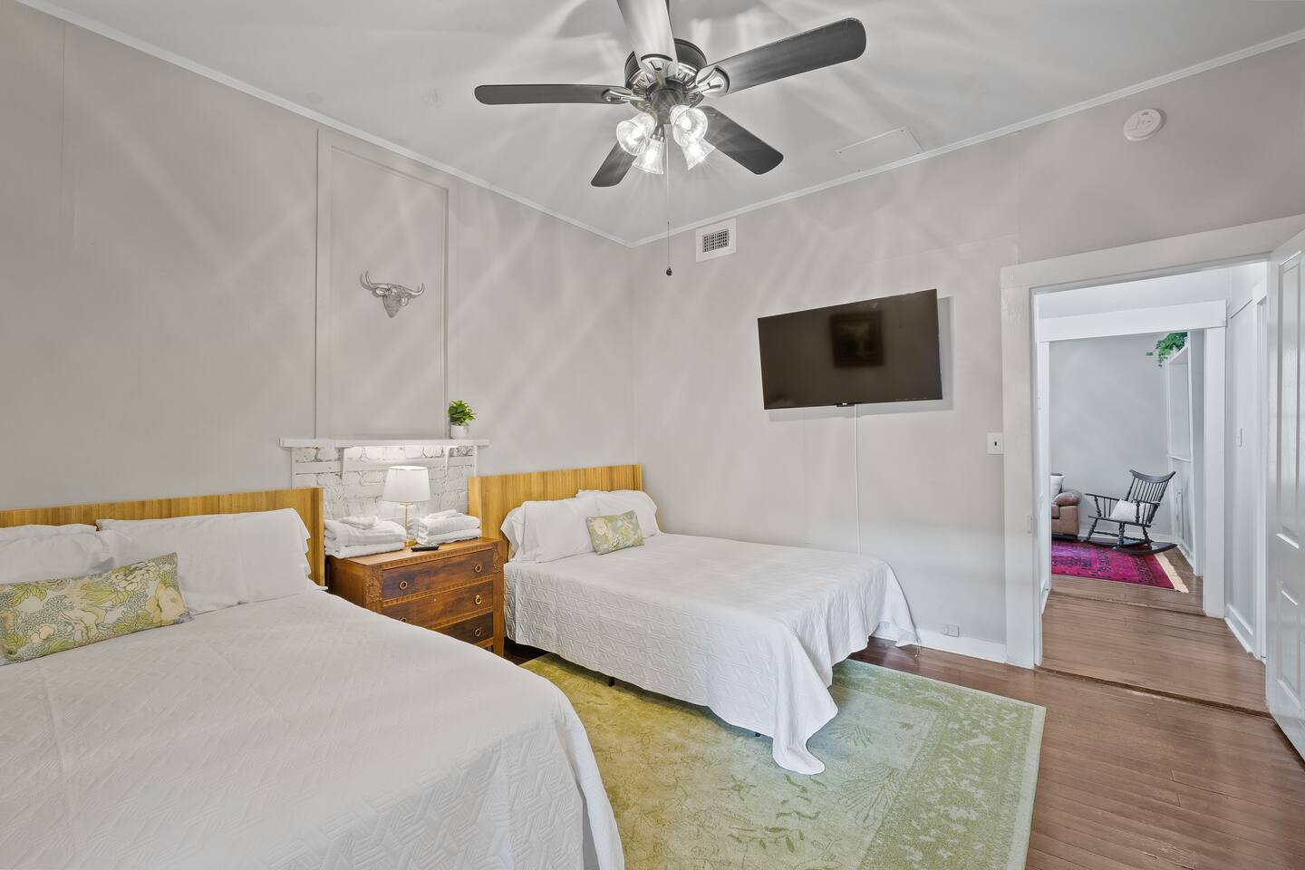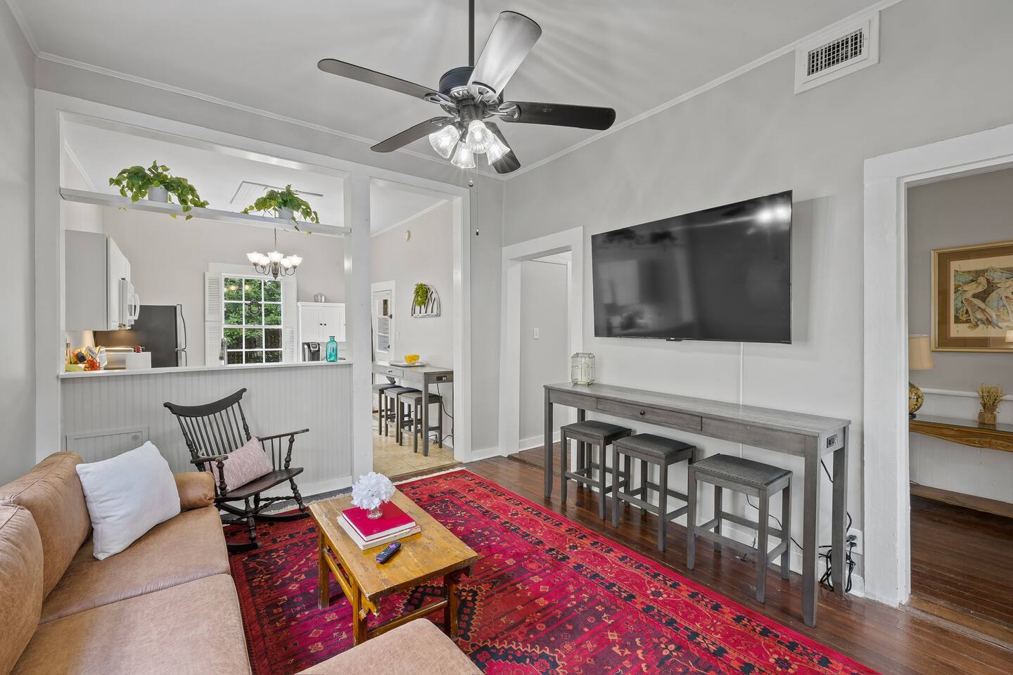Still with the historic feel of 1899, this home still exudes its original character and charm. Hardwood floors throughout and a mix of antique and modern furniture make this a great spot to enjoy historic Mobile. Book the entire triplex here and the whole place is yours! Our location is just the best toProperty features: ✓ Close By Parks and Walkable Neighborhood: Soak up the peaceful sounds of nature in Washington Square Park or walk to one of the local favorite restaurants in the area. ✓ Central A/C and Heating: No matter if it's winter or summer, the house will be at the right temperature with our heating and cooling system. ✓ Shared washer and Dryer on the property: For those who plan on booking for longer length stays, the washer and dryer will come in handy when it comes time to do your laundry. ✓ Free Parking: Driveway parking and street parking directly in front of the unit. ✓ Covid-19 Compliant: Health, safety, and well-being of our guests are of utmost importance. For this reason, we have a professional cleaning service ensuring a thorough cleaning before you check-in. All Three Kitchens: • Full-size refrigerator, Microwave, Coffee Pot, Filtered Water Pitcher, Oven/stove combo, Pots & pans for the cooktop, Dishwasher (unit 3 only) • Oil, salt and pepper • Complimentary quick breakfast (oatmeal and grits) • Complimentary coffee bar allowing you to brew yourself a warm cup of joe to start off with a gentle boost. • There are enough supplies in each of the kitchens for the amount of people that can stay in each unit (Cutting boards, spoons, knives, and spatulas, etc) If you’re not up for cooking, have peace of mind that a fine selection of dining options are within walking distance including the famous Callaghan's Irish Pub (GET THE BIG MIC) *check out our Guidebook for more suggestions* Unit 1: Living Room: (sleeps 2) • 2 Couches including 1 Queen-size sofa sleeper • table with 2 chairs • 65 inch smart TV with streaming services loaded • Bedding for sofa bed located in a container under the bed in the bedroom Bedroom (sleeps 2) • Full sized bed with memory foam mattress • Private Balcony off of the bedroom - perfect for enjoying your morning tea or coffee • Ensuite bathroom attached • 55" Smart TV with streaming services loaded • Clothes storage including hangers • Iron and ironing board Bathroom: Located directly off the bedroom, custom large shower • Hair dryer • Toilet paper • Shampoo & Conditioner • Soap/Shower gel • Towels, Washcloths, and hand towels (even makeup removal wipes) Office: • desk and chair with gorgeous natural light pouring in at the top of the stairs Unit 2: Living Room: (sleeps 2) • 2 Couches including 1 Queen-size sofa sleeper • table with 2 chairs • 65 inch smart TV with streaming services loaded • Bedding for sofa bed located in a container under the bed in the bedroom Bedroom (sleeps 2) • Full sized bed with memory foam mattress • Private Patio off of the bedroom - perfect for enjoying your morning tea or coffee • 55" Smart TV with streaming services loaded • Clothes storage including hangers • Iron and ironing board Bathroom: Located between the bedroom and living room, you'll be able to pamper yourself and end your day like a royalty with a refreshing shower in the custom built shower equipped with all the necessary toiletries: • Hair dryer • Toilet paper • Shampoo & Conditioner • Soap/Shower gel • Towels, Washcloths, and hand towels (even makeup removal wipes) Unit 3: Living Room Open Concept Living Room/Dining Room/Kitchen for enjoying everyone in the space. • Large Sectional Sofa • Rocking chair • Bar Table with seats • 65 inch smart TV with streaming services loaded Bedroom One (sleeps 2) • King sized bed with memory foam mattress • Close to the front porch - perfect for enjoying your morning tea or coffee • 55" Smart TV with streaming services loaded • Double closets and clothes storage including hangers Bedroom Two (sleeps 6-8) • 2 Queen sized beds with memory foam mattresses • 2 Twin cots with all bedding • Large walk in closet - that could easily fit 1 of the twin cot beds (all extra bedding and cots located here) • 55" Smart TV with streaming services loaded • Iron and ironing board Bathroom: Located down the hall for easy access to both bedrooms, you'll be able to enjoy a shower or bath • Shower/Tub Combo • Hair dryer • Toilet paper • Shampoo & Conditioner • Soap/Shower gel • Towels, Washcloths, and hand towels (even makeup removal wipes) Other (shared spaces) • Fire pit located in the backyard • Outdoor seating • There is a large historic front porch for everyone to share • Laundry room with washer and dryer PETS are NOT allowed at this location - if you have a Pet - reach out as we have other properties that are Pet friendly. All within 2-3 blocks from this location: Callaghan's Irish Pub (best BURGER ever - get the Big Mic) Washington Square Park The Oakleigh House Museum Hummingbird Way Oyster Bar Mardi Gras Parade Routes and MORE. OF NOTE: This is a triplex building. This means there are 3 entrances for each of the units housed in this one building. If you book this place - the entire property is yours (if you'd like just one of the units - contact me and i'll send you to our other listings). This is great spot for wedding guests and wedding parties. ——————-sleeping situation——————- Total: 16+ Bedroom 1: 2 - Full Bed (2) Bedroom 2: 2 - Full Bed (2) Bedroom 3: 2 - King Bed (2) Bedroom 4: 6 - Queen Bed x 2: (4) -Twin Cot x 2: (2) (easily able to be moved) Living Room 1: 2 - Queen sofa bed Living Room 2: 2 - Queen sofa bed Living Room 3: - sectional bed We are open to longer term stays as well as a quick get away! Book now for a memorable stay in Mobile! Local Guests: Please message us before booking and let us know what brings you to our home. We may require a refundable deposit for local s