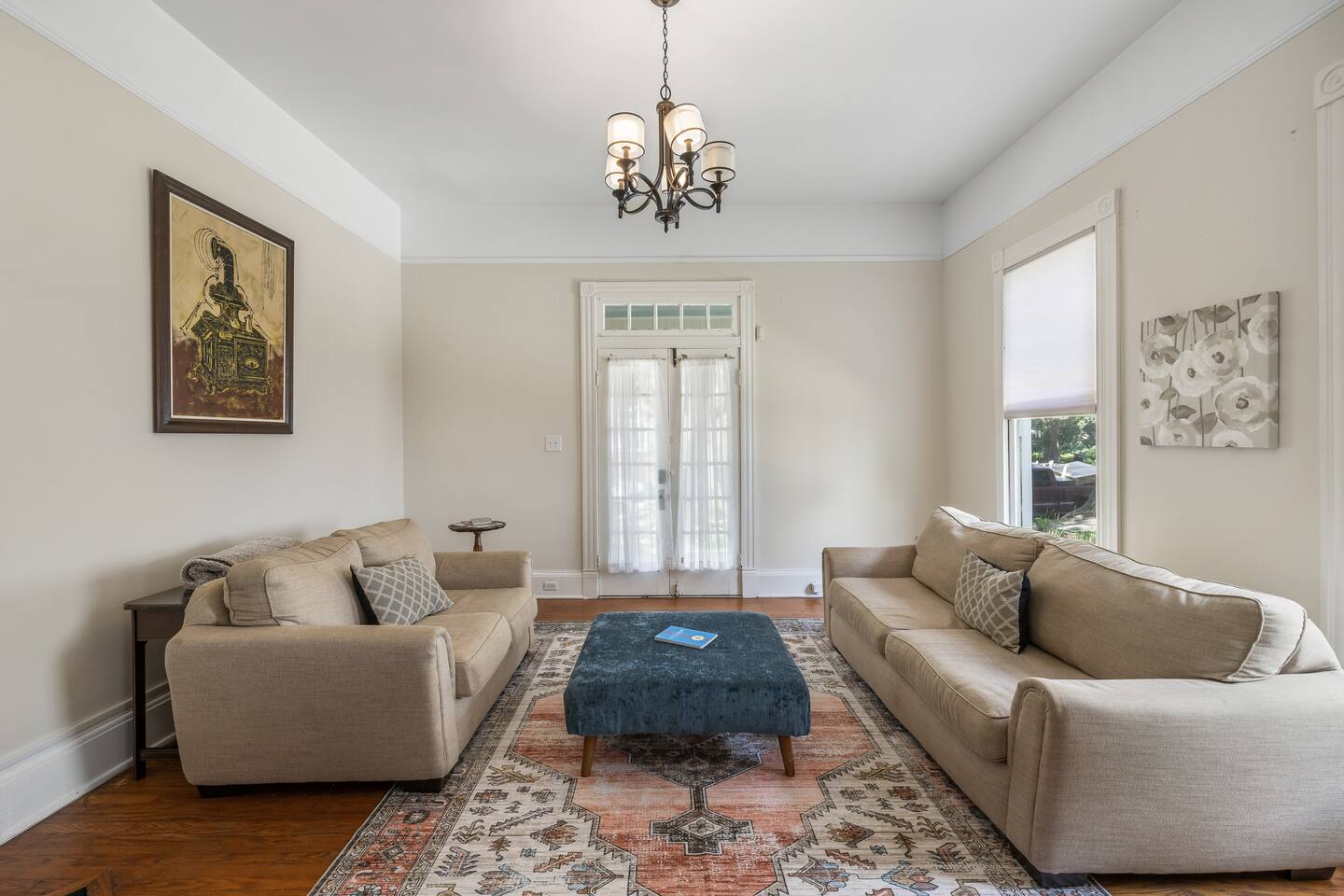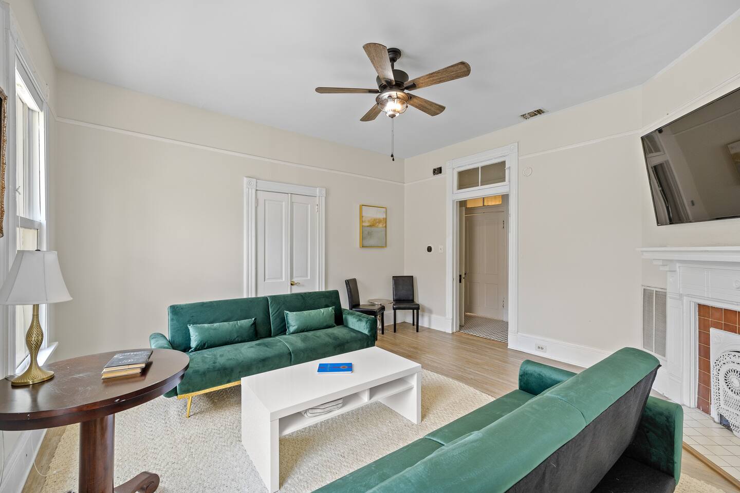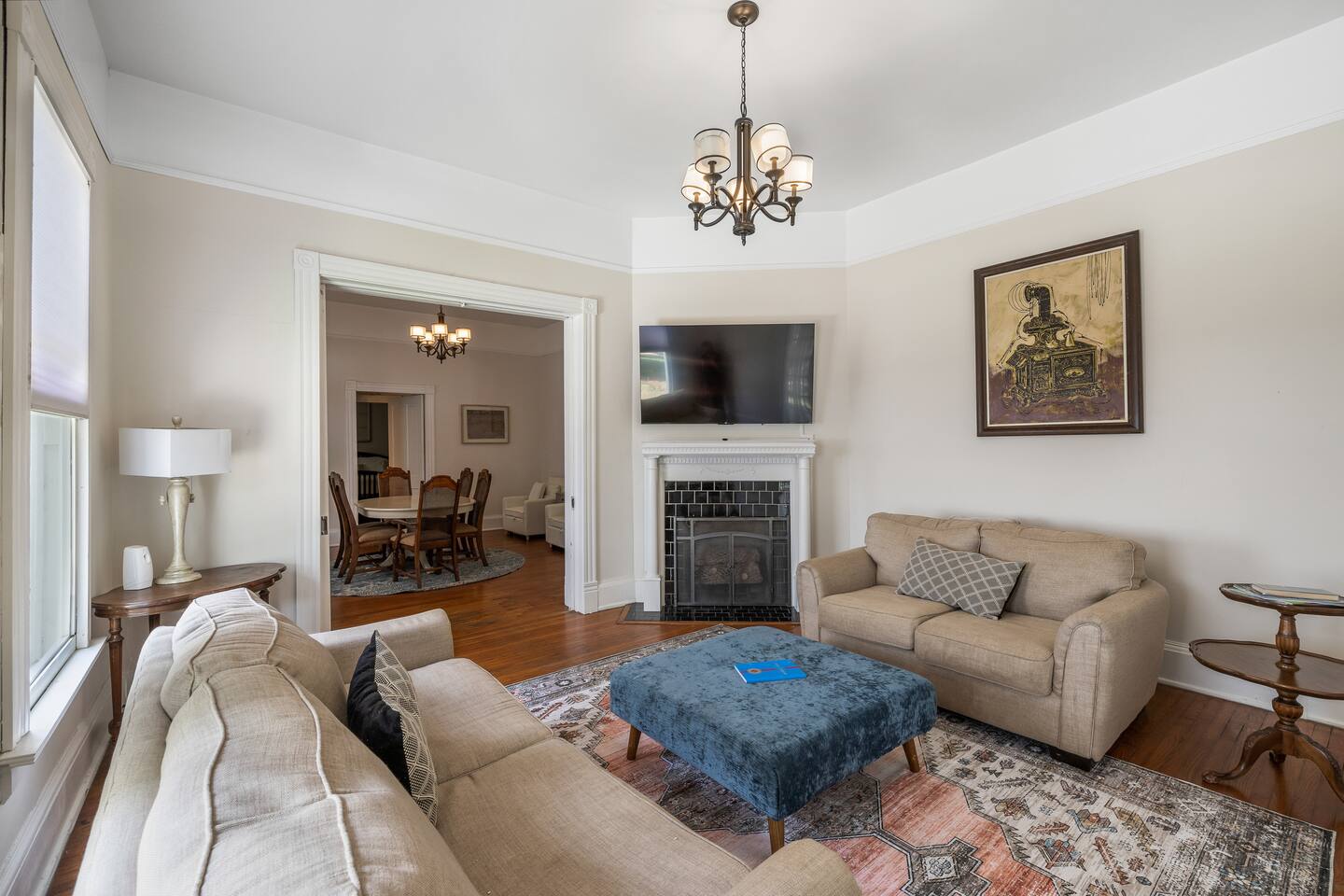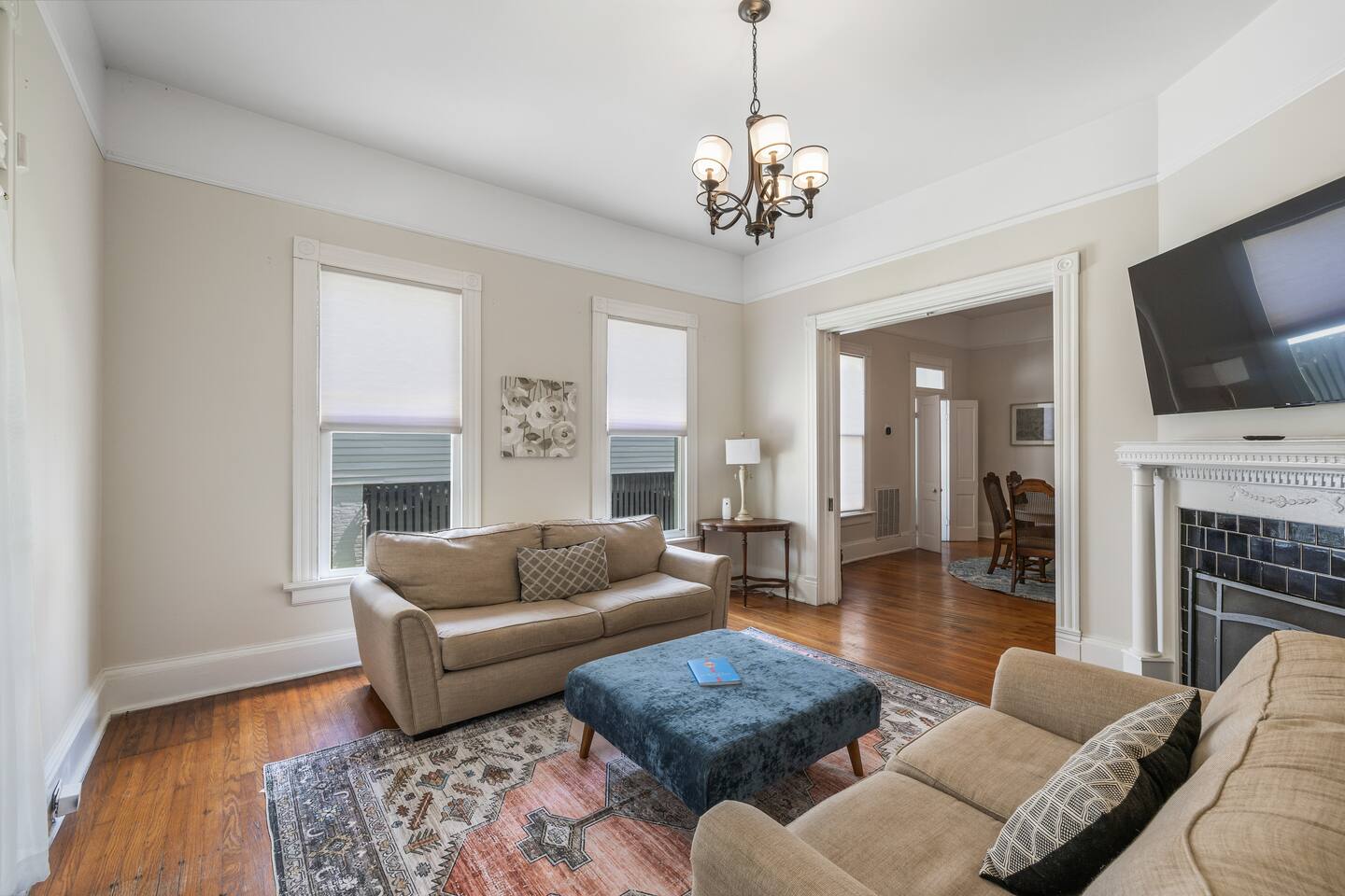 Discover the charm and convenience of the King George Estate, a 3,600+ sq. ft. home in Mobile's historic district. A short walk to the Mardi Gras parade route, Washington Square Park, local restaurants, and museums. Perfect for weddings, conferences, or large groups or families traveling together, this spacious triplex sleeps up to 22 people with a mix of beds, futons, and cots. EV Charger on site, pet friendly, free wifi and more - you'll love the newly updated kitchen and bathrooms, complete with stylish and modern flooring throughout. Built in 1905, this home still exudes its original character and charm. All while located within walking distance of many historic attractions. Or stay home and enjoy the beautiful Mobile weather from the southern front porch, complete with a fire table and outdoor seating. You won't beat our location! Downtown is just minutes away and Orange Beach, Gulf Shores, Pensacola, and Dauphin Island are less than an hour drive! But the best part? We're just a short 3-4 block walk to the Mardi Gras parade route. Here are some specific unit details that might help when planning your stay: Property features: ✓ Close By Parks and Walkable Neighborhood: Soak up the peaceful sounds of nature in Washington Square Park or walk to one of the local favorite restaurants in the area. ✓ Central A/C and Heating: No matter if it's winter or summer, the house will be at the right temperature with our heating and cooling system. ✓ Washer and Dryer in every unit: For those who plan on booking for longer length stays, the washer and dryer will come in handy when it comes time to do your laundry. ✓ Free Parking: Off Street parking for 4 cars in the back of the house and street parking available directly in front of the house. ✓ Covid-19 Compliant: Health, safety, and well-being of our guests are of utmost importance. For this reason, we have a professional cleaning service ensuring a thorough cleaning before you check-in. This property is a triplex and booking this listing means you'll have access to the entire place. All units have private entrances, but are located under 1 roof. 2 units are downstairs and the third (and largest unit) is the entire upstairs. Here's the details: Living Room 1: • 2 couches (one converts to a full size sofa bed) • 65 inch TV Living Room 2: • Full-size sofa sleeper couch • 2 Twin cots (located in the primary bedroom closet) • 2 sitting chairs • Writing Desk • Large table with 6 chairs • 65 inch smart TV with streaming services loaded Living Room 3: • 2 Futon Sofas • 2 sitting chairs • 65 inch smart TV with streaming services loaded Kitchens: All 3 kitchens include the appliances and amenities to make you feel right at home • Full-size refrigerator • Microwave • Dishwasher • Drip Coffee Pot • Filtered Water Pitcher • Gas oven/stove combo • Pots & pans for the cooktop • Oil, salt and pepper • Complimentary quick breakfast (oatmeal and grits) • Complimentary coffee bar allowing you to brew yourself a warm cup of joe to start off with a gentle boost. • There are enough supplies in the kitchen for everyone (Cutting boards, spoons, knives, plates, spatulas, etc) If you’re not up for cooking, have peace of mind that a fine selection of dining options are within walking distance including the famous Callaghan's Irish Pub (GET THE BIG MIC) *check out our Guidebook for more suggestions* Living/Dining Room (Unit 1) Open concept with the living room with dining for 6 and lounging for 2. • 6 seater table • 6 dining room chairs • 2 chairs that convert to 2 twin beds OF NOTE: there are VERY old pocket doors in the cased opening - please don't try to open them as they are very difficult to get back in the "pocket" :) •shared space with the living room. Bedroom 1: primary bedroom unit 1: • KING sized bed with memory foam mattress • full bathroom attached • Full size dresser for all your clothes • LARGE walk-in closet • 55 inch TV with streaming services Bedroom 2: Primary Bedroom Unit 2: • KING sized bed with memory foam mattress • Ensuite bathroom • 2 twin cots are located in the closet • 55" Smart TV with streaming services • Clothes storage including drawers and hangers Bedroom 3: Primary Bedroom Unit 3 • KING sized bed with memory foam mattress • Ensuite bathroom • 55" Smart TV with streaming services • Clothes storage including drawers and hangers Bedroom 4: Bedroom 2 of Unit 3: • 1 Queen sized bed with memory foam mattress • 2 Full sized beds with memory foam mattresses • Bathroom and Laundry room attached • 55" Smart TV with streaming services • Clothes storage including drawers and hangers **extra bedding for futons are located in this bedroom closet** Bathrooms: There are 4 Full bathrooms all with the same amenities in each: • Hair dryer • Toilet paper • Shampoo & Conditioner • Soap/Shower gel • Towels, Washcloths, and hand towels (even makeup removal wipes) Bathroom 1: Unit 1: • Shower/Tub Combo Bathroom 2: Unit 2: • Shower Only Bathroom 3: Unit 3 • Shower/Tub Combo Bathroom 4: Unit 3 • Shower/Tub Combo Other (shared spaces) • Fire table located on the front porch (propane tank provided, but not refilled) • Outdoor seating • Charcoal Grill • There is a large historic front porch • Full size washers and dryers in each unit All within 2-3 blocks from this location: Callaghan's Irish Pub (best BURGER ever - get the Big Mic) Washington Square Park The Oakleigh House Museum Hummingbird Way Oyster Bar Mardi Gras Parade Routes and MORE. This is great spot for wedding guests and wedding parties. ——————-sleeping situation——————- Bedroom 1 (unit 1): 2 - King Bed (2) Living Room (unit 1): 4 - Full size sofa bed (2) - Twin convertible chairs (2) Bedroom 2 (unit 2): 2 - King Bed (2) Living Room (unit 2): 4 - Full size sofa bed (2) - Twin cots (2) Bedroom 3 (unit 3): 2 - King Bed (2) Bedroom 4 (unit 3): 6 - Queen bed (2)