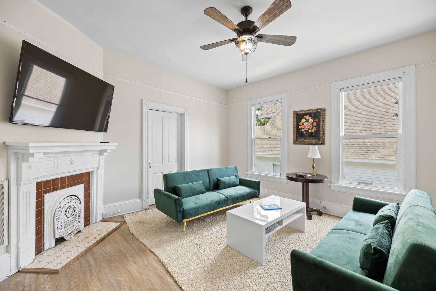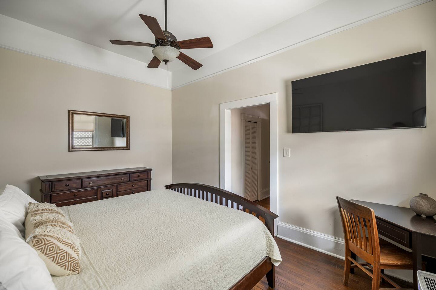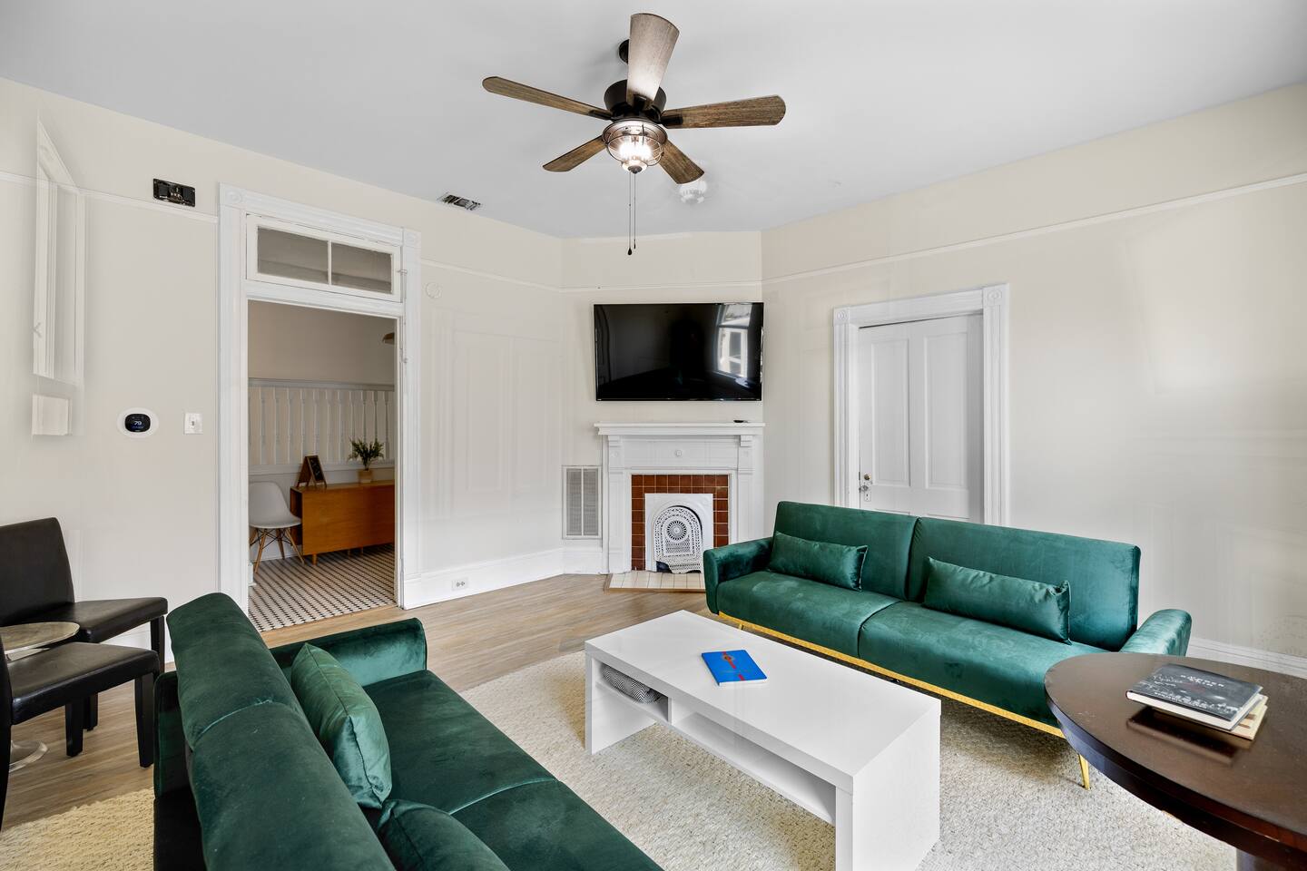Discover the charm and convenience of the King George Estate, a 3,600+ sq. ft. home in Mobile's historic district. A short walk to the Mardi Gras parade route, Washington Square Park, local restaurants, and museums. Perfect for weddings, conferences, or large groups or families traveling together, this spacious triplex sleeps up to 22 people with a mix of beds, futons, and cots. EV Charger on site, pet friendly, free wifi and more - you'll love the newly updated kitchen and bathrooms, complete with stylish and modern flooring throughout. Built in 1905, this home still exudes its original character and charm. All while located within walking distance of many historic attractions. Or stay home and enjoy the beautiful Mobile weather from the southern front porch, complete with a fire table and outdoor seating. You won't beat our location! Downtown is just minutes away and Orange Beach, Gulf Shores, Pensacola, and Dauphin Island are less than an hour drive! But the best part? We're just a short 3-4 block walk to the Mardi Gras parade route. Here are some specific unit details that might help when planning your stay: Property features: ✓ Close By Parks and Walkable Neighborhood: Soak up the peaceful sounds of nature in Washington Square Park or walk to one of the local favorite restaurants in the area. ✓ Central A/C and Heating: No matter if it's winter or summer, the house will be at the right temperature with our heating and cooling system. ✓ Washer and Dryer in every unit: For those who plan on booking for longer length stays, the washer and dryer will come in handy when it comes time to do your laundry. ✓ Free Parking: Off Street parking for 4 cars in the back of the house and street parking available directly in front of the house. ✓ Covid-19 Compliant: Health, safety, and well-being of our guests are of utmost importance. For this reason, we have a professional cleaning service ensuring a thorough cleaning before you check-in. This property is a triplex and booking this listing means you'll have access to the entire place. All units have private entrances, but are located under 1 roof. 2 units are downstairs and the third (and largest unit) is the entire upstairs. Here's the details: Living Room 1: • 2 couches (one converts to a full size sofa bed) • 65 inch TV Living Room 2: • Full-size sofa sleeper couch • 2 Twin cots (located in the primary bedroom closet) • 2 sitting chairs • Writing Desk • Large table with 6 chairs • 65 inch smart TV with streaming services loaded Living Room 3: • 2 Futon Sofas • 2 sitting chairs • 65 inch smart TV with streaming services loaded Kitchens: All 3 kitchens include the appliances and amenities to make you feel right at home • Full-size refrigerator • Microwave • Dishwasher • Drip Coffee Pot • Filtered Water Pitcher • Gas oven/stove combo • Pots & pans for the cooktop • Oil, salt and pepper • Complimentary quick breakfast (oatmeal and grits) • Complimentary coffee bar allowing you to brew yourself a warm cup of joe to start off with a gentle boost. • There are enough supplies in the kitchen for everyone (Cutting boards, spoons, knives, plates, spatulas, etc) If you’re not up for cooking, have peace of mind that a fine selection of dining options are within walking distance including the famous Callaghan's Irish Pub (GET THE BIG MIC) *check out our Guidebook for more suggestions* Living/Dining Room (Unit 1) Open concept with the living room with dining for 6 and lounging for 2. • 6 seater table • 6 dining room chairs • 2 chairs that convert to 2 twin beds OF NOTE: there are VERY old pocket doors in the cased opening - please don't try to open them as they are very difficult to get back in the "pocket" :) •shared space with the living room. Bedroom 1: primary bedroom unit 1: • KING sized bed with memory foam mattress • full bathroom attached • Full size dresser for all your clothes • LARGE walk-in closet • 55 inch TV with streaming services Bedroom 2: Primary Bedroom Unit 2: • KING sized bed with memory foam mattress • Ensuite bathroom • 2 twin cots are located in the closet • 55" Smart TV with streaming services • Clothes storage including drawers and hangers Bedroom 3: Primary Bedroom Unit 3 • KING sized bed with memory foam mattress • Ensuite bathroom • 55" Smart TV with streaming services • Clothes storage including drawers and hangers Bedroom 4: Bedroom 2 of Unit 3: • 1 Queen sized bed with memory foam mattress • 2 Full sized beds with memory foam mattresses • Bathroom and Laundry room attached • 55" Smart TV with streaming services • Clothes storage including drawers and hangers **extra bedding for futons are located in this bedroom closet** Bathrooms: There are 4 Full bathrooms all with the same amenities in each: • Hair dryer • Toilet paper • Shampoo & Conditioner • Soap/Shower gel • Towels, Washcloths, and hand towels (even makeup removal wipes) Bathroom 1: Unit 1: • Shower/Tub Combo Bathroom 2: Unit 2: • Shower Only Bathroom 3: Unit 3 • Shower/Tub Combo Bathroom 4: Unit 3 • Shower/Tub Combo Other (shared spaces) • Fire table located on the front porch (propane tank provided, but not refilled) • Outdoor seating • Charcoal Grill • There is a large historic front porch • Full size washers and dryers in each unit All within 2-3 blocks from this location: Callaghan's Irish Pub (best BURGER ever - get the Big Mic) Washington Square Park The Oakleigh House Museum Hummingbird Way Oyster Bar Mardi Gras Parade Routes and MORE. This is great spot for wedding guests and wedding parties. ——————-sleeping situation——————- Bedroom 1 (unit 1): 2 - King Bed (2) Living Room (unit 1): 4 - Full size sofa bed (2) - Twin convertible chairs (2) Bedroom 2 (unit 2): 2 - King Bed (2) Living Room (unit 2): 4 - Full size sofa bed (2) - Twin cots (2) Bedroom 3 (unit 3): 2 - King Bed (2) Bedroom 4 (unit 3): 6 - Queen bed (2)