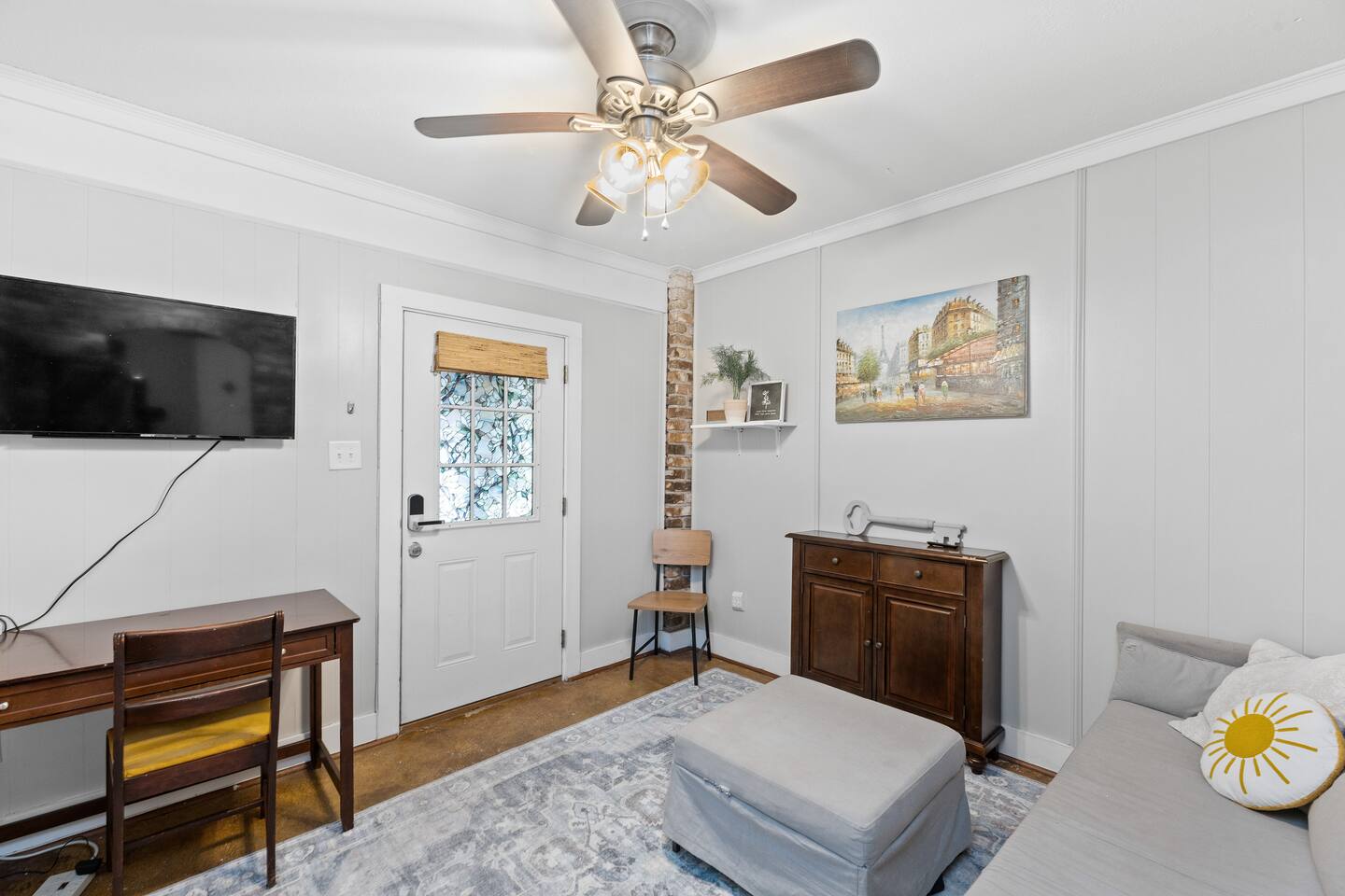 Experience the charm of the Gulf Coast through the artistry woven into every corner of this space. The Grand A showcases stunning creations from local artists and artisans in Mobile and New Orleans, including woodworking, pottery, acrylic, and oil paintings that bring a unique, creative touch to your stay. The cottage features a spacious bedroom, an eat-in kitchen complete with a dining table, and a cozy living room perfect for unwinding, watching TV, or sharing laughs with loved ones. Step outside to enjoy the courtyard with comfortable seating—a peaceful retreat for morning coffee or evening relaxation. With its thoughtful layout and inviting atmosphere, this space is ideal for couples, small families, or close friends traveling together, offering the perfect balance of comfort and style. Here are some specific unit details that might help when planning your stay: Property features: Keep reading to learn more about our extra benefits and start planning your trip to Mobile, AL today! ✓ Covid-19 Compliant: Health, safety, and well-being of our guests are of utmost importance. For this reason, we have a professional cleaning service ensuring a thorough cleaning before you check-in (available during your stay as well for an extra charge) ✓ Washer and Dryer in Unit: For those who plan on booking for longer length stays, the washer and dryer will come in handy when it comes time to do your laundry. ✓ A/C and Heating: No matter if it's winter or summer, the house will always be at the right temperature with our heating and cooling system. ✓ Outdoor Courtyard: Soak up the peaceful sounds of nature in the fenced backyard, complete with a patio, outdoor seating and tables and more. ✓ Free Covered Parking: You’ll have plenty of parking available on the premises to safely park your vehicle. There are enough spots for at least 2 cars (parking one behind the other) under the carport. Living Room: Equipped with tons of space for togetherness while surrounded by gorgeous windows to let in natural light! • couch (converts to a queen size bed) • 60 inch TV **Extra bedding for the sofa bed located in the bedroom walk-in closet** Kitchen We can't wait for you to cook up some happy memories in our updated kitchen! You’ll surely bring your culinary pursuits to life using our: • Full-size refrigerator • Microwave • Dishwasher • Coffee Pot • Filtered Water Pitcher • oven/stove combo • Fully stocked with all equipment you'll need to cook • Oil, salt, pepper • Complimentary quick breakfast (oatmeal and grits) • Complimentary coffee bar allowing you to brew yourself a warm cup of joe to start off with a gentle boost. OF NOTE: There are enough supplies in the kitchen for 4 people to stay (Cutting boards, spoons, knives, and spatulas, etc) If you’re not up for cooking, have peace of mind that a fine selection of dining options are within walking distance. (check out our guidebook) Laundry: • Full size washer and dryer • Iron and ironing board Bedroom: There is 1 large primary bedroom: • Queen sized bed • dresser for all your clothes • LARGE walk-in closet with hangers • 55 inch TV Bathroom: Pamper yourself and end your day like a royalty with a refreshing shower equipped with all the necessary toiletries: • Hair dryer • Toilet paper • Shampoo & Conditioner • Soap/Shower gel • Towels, Washcloths, and hand towels • Even makeup remover wipes Courtyard • There is a small patio located directly off the kitchen where you can enjoy outdoor seating and Mobile weather. Other • Precious porch swing in the carport especially for you! _____________Sleeping Situation_________________ Comfortably sleeps 4 guests: - Bedroom: 2 - Living Room: 2 - Dining/Living Room: 0 If you have more than this number - don't hesitate to reach out as we would love to try to accommodate you (we have 2 more listings on this property that might be available as well) OF NOTE: Great spot for almost complete handicapped accessibility (there is a small step from the living room to the kitchen area and a curb on the shower, but all other areas are very open and accessible for wheelchairs. This home is on a property with a large shared parking area and another almost identical unit next door - NO inside spaces are shared. If you have more than 4 people and would like to book two of these units at the same location - contact me to see what’s available. We do allow pets at this location, but we'd ask that you contact us before bringing your pet. Local Guests: Please message us before booking and let us know what brings you to our home. We may require a refundable deposit for local stays to help prevent parties.