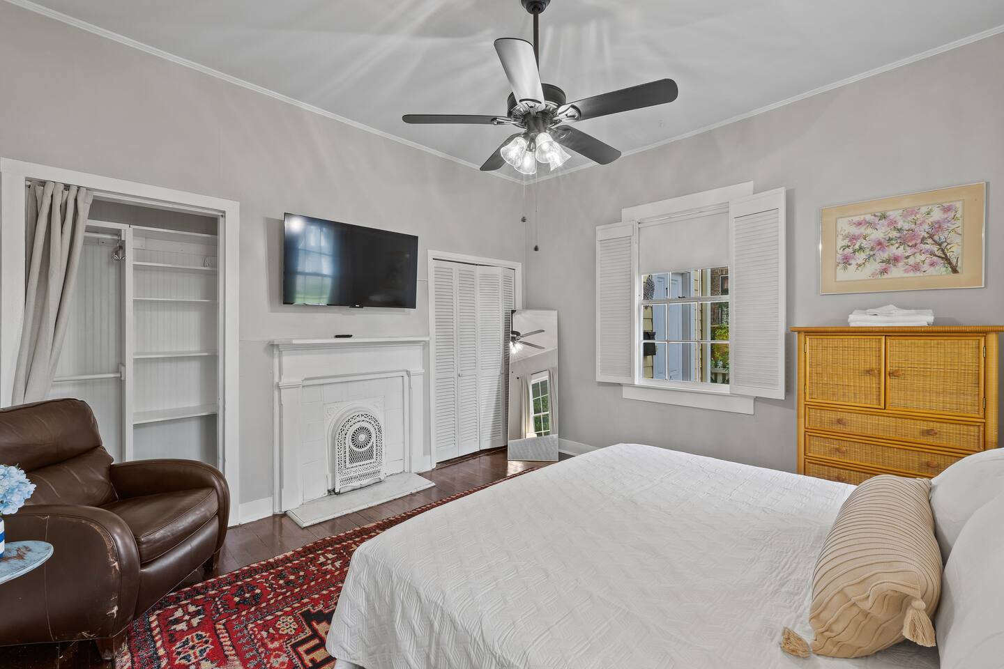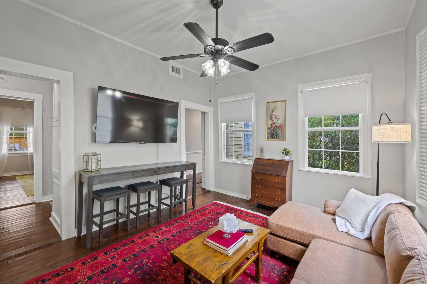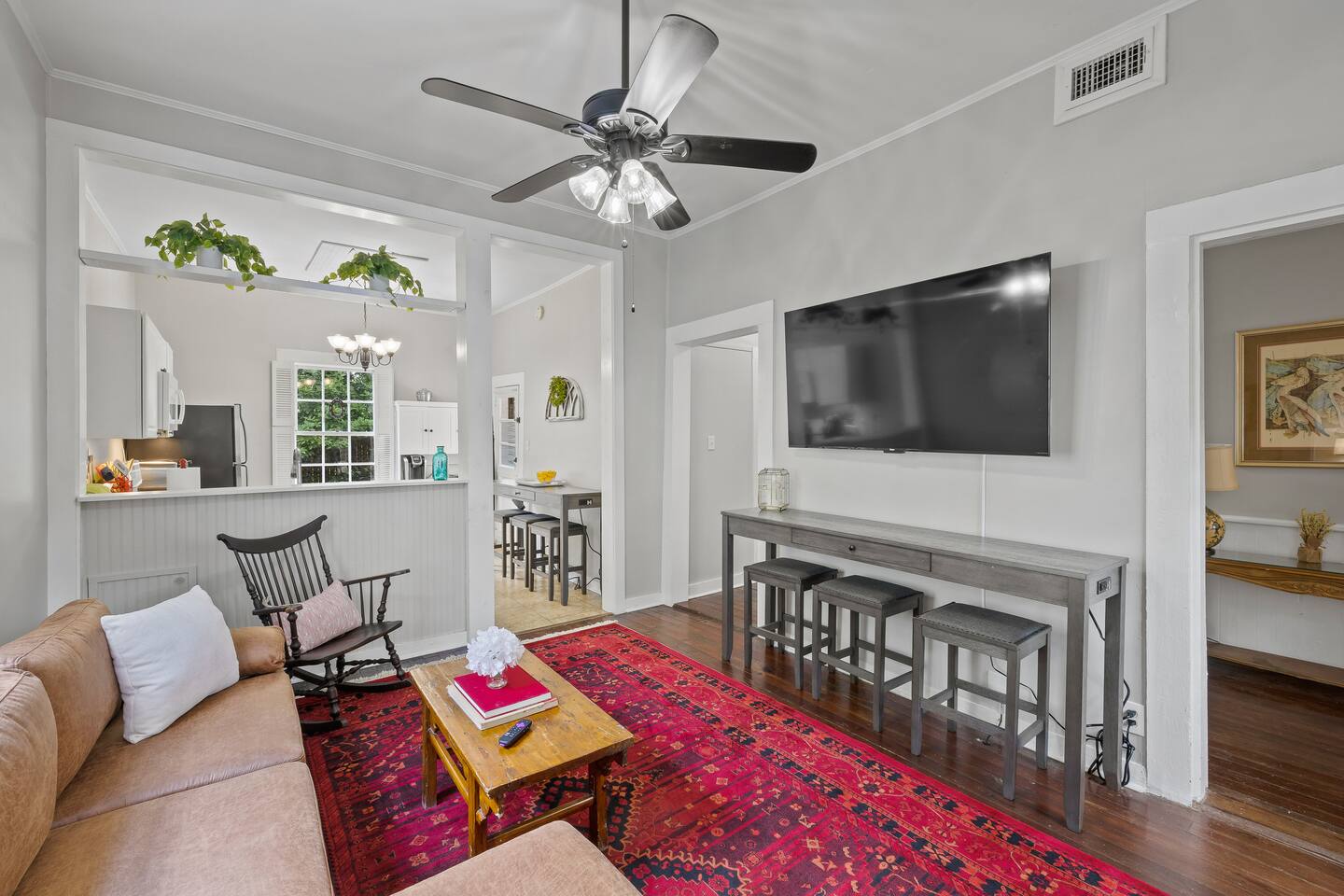 Still with the historic feel of 1899, this home still exudes its original character and charm. Hardwood floors throughout and a mix of antique and modern furniture make this a great spot to enjoy historic Mobile. Our location is just the best too! Downtown is just minutes away making your trip to Orange Beach, Gulf Shores and Pensacola beach about 1 hour and Dauphin Island just 45 min. But the best part? We're just a short 3-4 block walk to the Mardi Gras parade route. Here are some specific unit details that might help when planning your stay: Property features: ✓ Close By Parks and Walkable Neighborhood: Soak up the peaceful sounds of nature in Washington Square Park or walk to one of the local favorite restaurants in the area. ✓ Central A/C and Heating: No matter if it's winter or summer, the house will be at the right temperature with our heating and cooling system. ✓ Shared washer and Dryer on the property: For those who plan on booking for longer length stays, the washer and dryer will come in handy when it comes time to do your laundry. ✓ Free Parking: Street parking available directly in front of the front door to the house. ✓ Covid-19 Compliant: Health, safety, and well-being of our guests are of utmost importance. For this reason, we have a professional cleaning service ensuring a thorough cleaning before you check-in. Living Room Open Concept Living Room/Dining Room/Kitchen for enjoying everyone in the space. • Large Sectional Sofa • Rocking chair • Bar Table with seats • 65 inch smart TV with streaming services loaded • Gorgeous windows with natural lighting Kitchen: • Bar Table with seats • Full-size refrigerator • Microwave • Coffee Pot • Filtered Water Pitcher • Oven/stove combo • Pots & pans for the cooktop • Oil, salt and pepper • Complimentary coffee bar allowing you to brew yourself a warm cup of joe to start off with a gentle boost. • There are enough supplies in the kitchen for 8 people to stay (Cutting boards, spoons, knives, and spatulas, etc) If you’re not up for cooking, have peace of mind that a fine selection of dining options are within walking distance including the famous Callaghan's Irish Pub (GET THE BIG MIC) *check out our Guidebook for more suggestions* Bedroom One (sleeps 2) • King sized bed with memory foam mattress • Close to the front porch - perfect for enjoying your morning tea or coffee • 55" Smart TV with streaming services loaded • Double closets and clothes storage including hangers Bedroom Two (sleeps 6-8) • 2 Queen sized beds with memory foam mattresses • 2 Twin cots with all bedding • Large walk in closet - that could easily fit 1 of the twin cot beds (all extra bedding and cots located here) • 55" Smart TV with streaming services loaded • Iron and ironing board Bathroom: Located down the hall for easy access to both bedrooms, you'll be able to enjoy a shower or bath • Shower/Tub Combo • Hair dryer • Toilet paper • Shampoo & Conditioner • Soap/Shower gel • Towels, Washcloths, and hand towels (even makeup removal wipes) Other (shared spaces) • Fire pit located in the backyard • Outdoor seating • There is a large historic front porch for everyone to share • Laundry room with washer and dryer PETS are NOT allowed at this location - if you have a Pet - reach out as we have other properties that are Pet friendly. All within 2-3 blocks from this location: Callaghan's Irish Pub (best BURGER ever - get the Big Mic) Washington Square Park The Oakleigh House Museum Hummingbird Way Oyster Bar Mardi Gras Parade Routes and MORE. OF NOTE: This unit is in a triplex building - NO inside spaces are shared, except the laundry room which is located through a door around the back of the house. If you have more than 8 people and would like to book more than one of these units at the same location - contact me and I'd be happy to accommodate you all. This is great spot for wedding guests and wedding parties. ——————-sleeping situation——————- Bedroom 1: 2 - King Bed (2) Bedroom 2: 6 - Queen Bed x 2: (4) -Twin Cot x 2: (2) (easily able to be moved) We are open to longer term stays as well as a quick get away! Book now for a memorable stay in Mobile! Local Guests: Please message us before booking and let us know what brings you to our home. We may require a refundable deposit for local stays to help prevent parties.